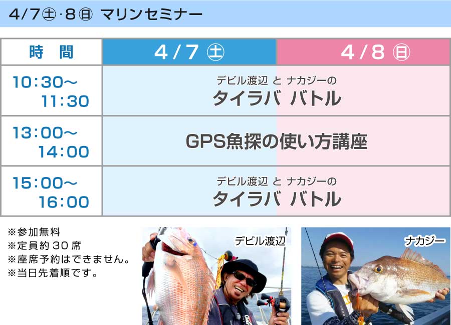 22日(土)と23日(日)に行われるマリンセミナーでは、フィッシングキャスターの伊丹章さんや、釣りガールの蒼井さやさん、デビルワタナベさんも参加!