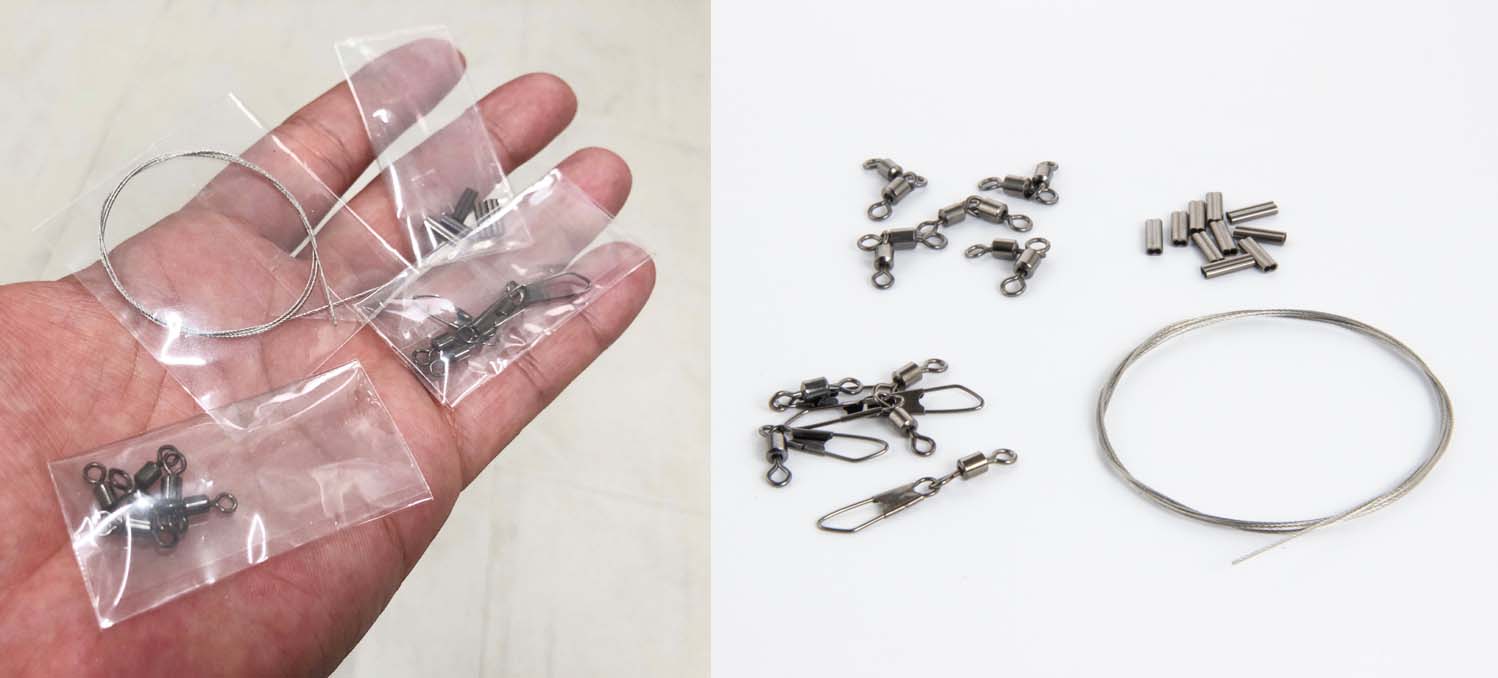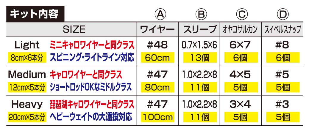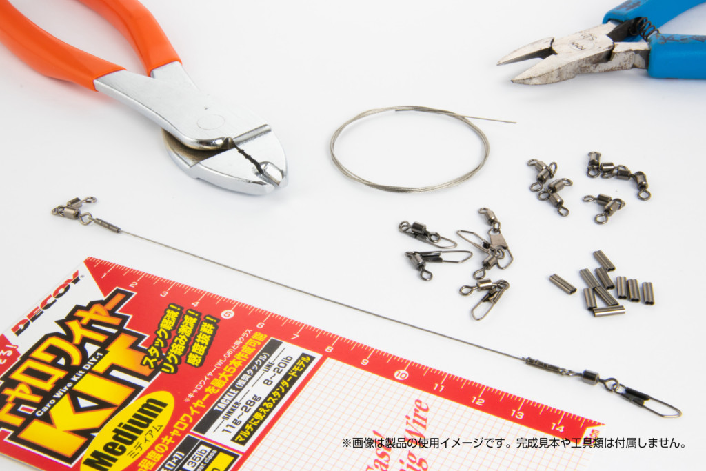 これまで出ていたキャロワイヤーシリーズは、すでにリグ・仕掛けになっている便利なモノだったのだけど、今回のキャロワイヤーキットは、自分で好きな長さのキャロワイヤーが自作できるキット! 既製品には無い、好みの長さに調整が可能なヘビーユーザー向けのNEWアイテム商品です。